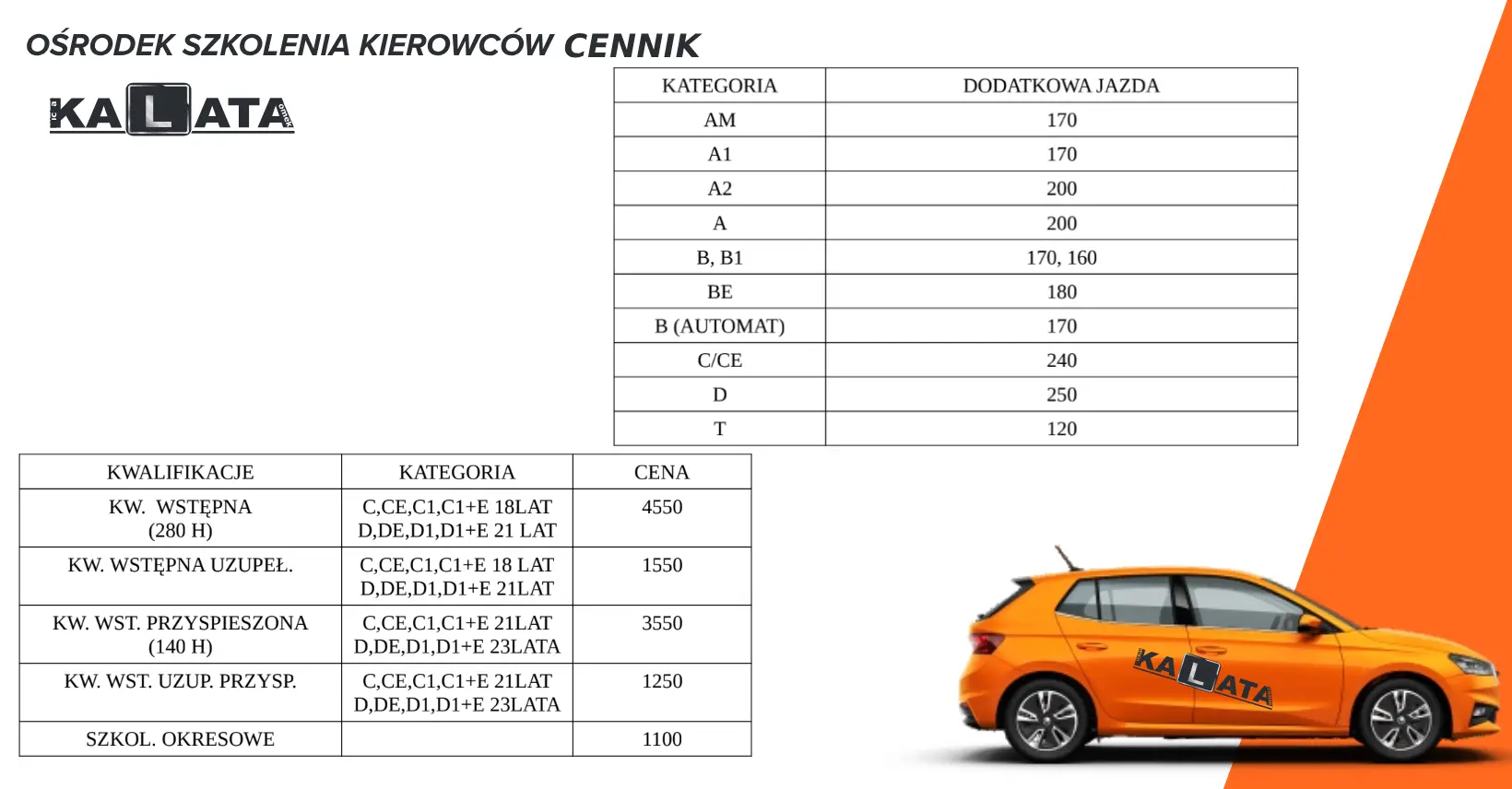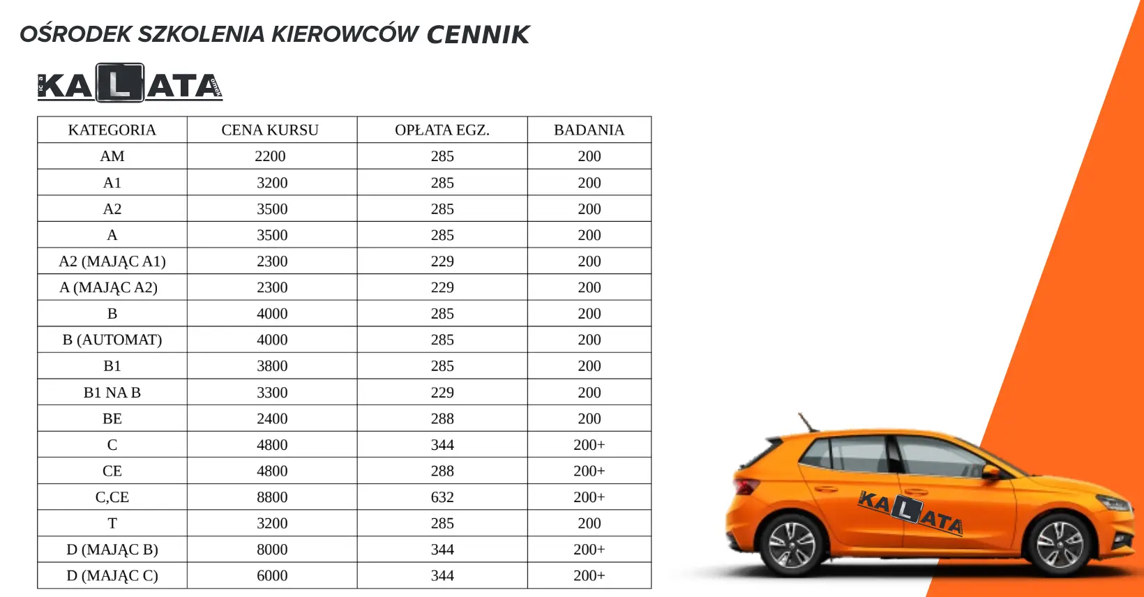 Kursy przeprowadzamy na samochodach: Skoda Fabia. Kurs trwa 30 godzin zajęć teoretycznych oraz 30 godzin praktycznych.